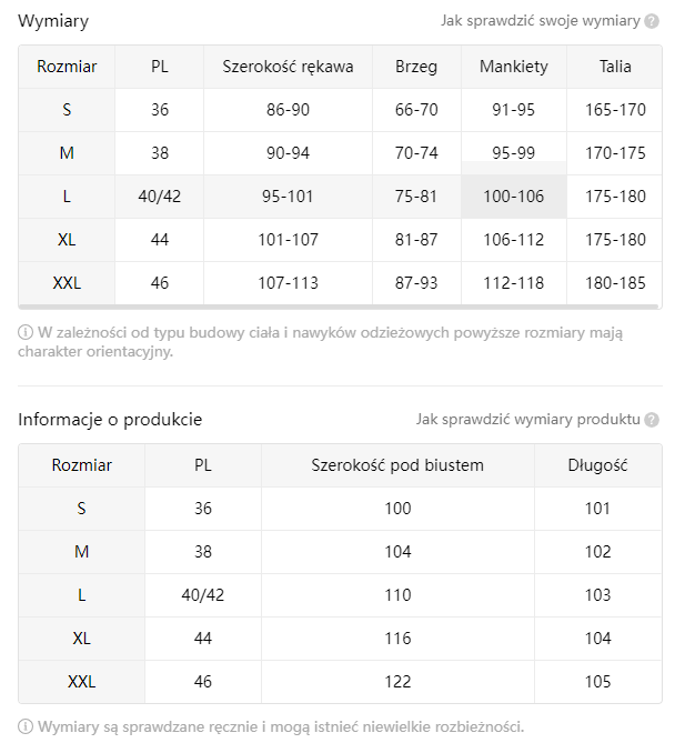 Rozmiar może różnić się o 1-3 cm ze względu na pomiary ręczne. Należy wziąć to pod uwagę podczas dokonywania pomiarów.