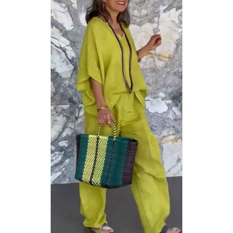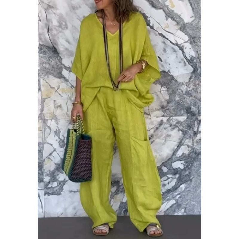 ODDYCHAJĄCA TKANINA BAWEŁNIANO-LNIANA: Wykonany z miękkiej mieszanki bawełny i lnu, ten zestaw jest lekki, oddychający i idealny na ciepłe dni, zapewniając chłód i wygodę.
